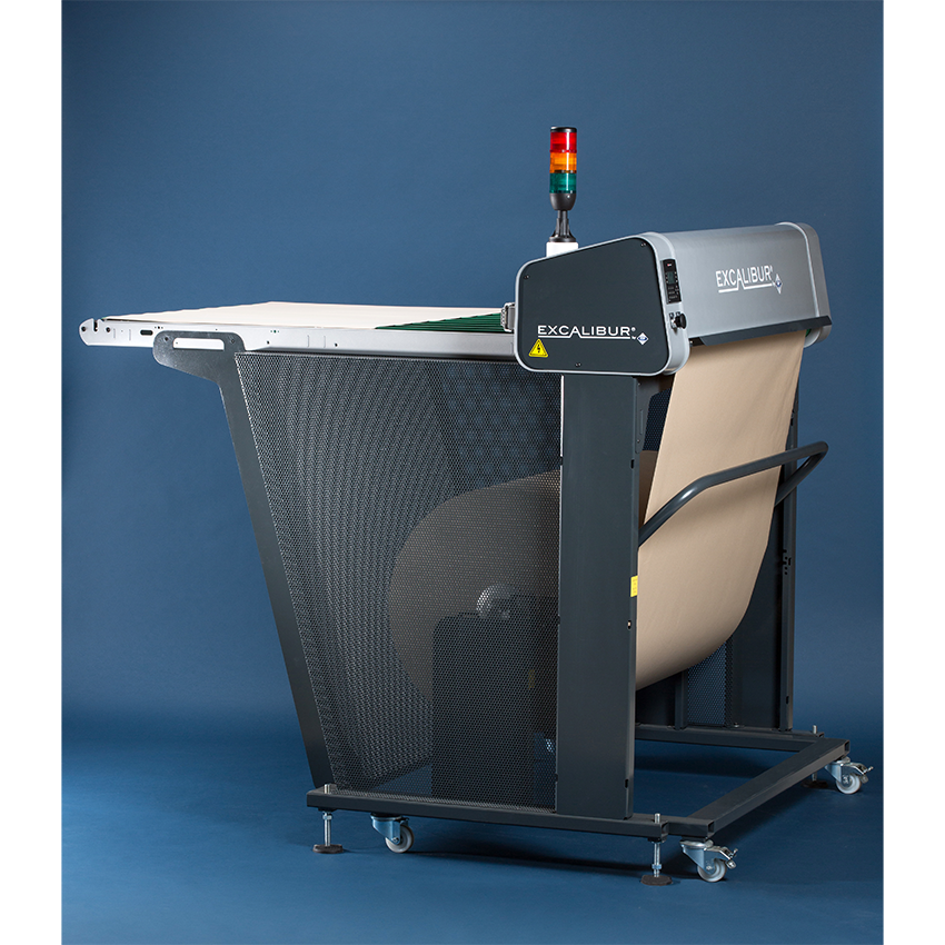 Der EXCALIBUR® CLASSIC 1200 ist für Kraft- und Anti-Rutsch-Papier mit einem Flächengewicht von 60 bis 300 g/m² geeignet. Mit einer Leistung von bis zu sechs Bögen pro Minute ist das Gerät für hohe Durchsatzanforderungen ausgelegt. Es verfügt über eine kontinuierliche Überwachung des Rollendurchmessers mit einer Alarmfunktion für den Bediener, um den Rollenwechsel zu optimieren. Das Rollensystem wird durch einen speziellen Rollentrolley unterstützt, der den Wechsel vereinfacht und beschleunigt.